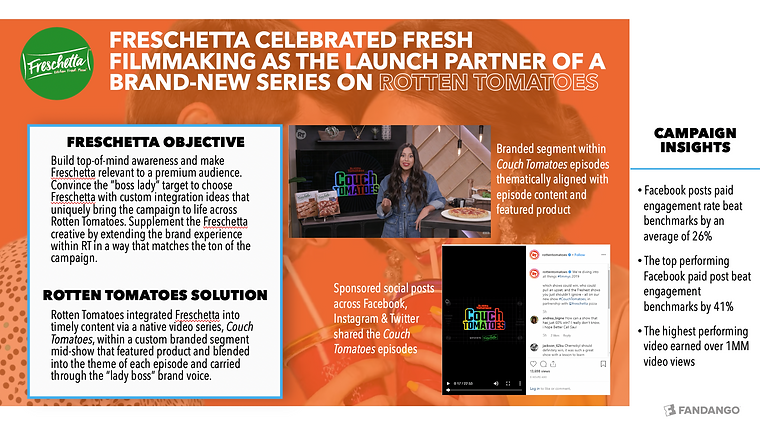 As an expert in executing integrated marketing campaigns particularly in product placement within custom video series, I excel in project planning, client relations, and delivering actionable insights. in 2019, a client sought to target the girl boss demographic while aligning with the latest TV news. I developed and pitched a first-to-market launch partnership on a new Rotten Tomatoes show, strategically integrating custom segments featuring industry talent.